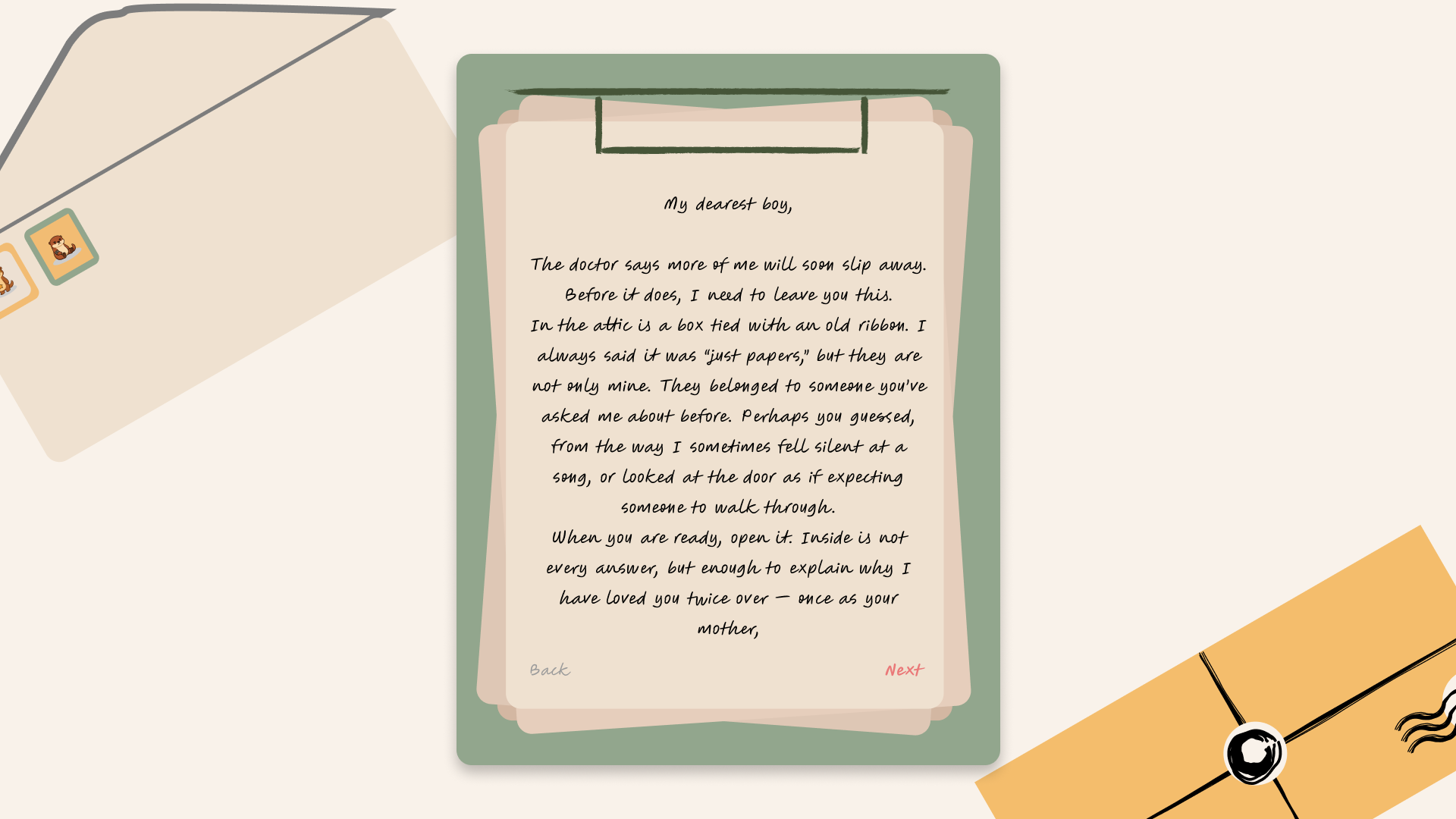 Between the Lines is a narrative-driven game where players shape the story through the power of words. Uncover each character’s journey by exchanging letters within the game. Word by word, sentence by sentence, you’ll reveal the connection between a character and their correspondent. Guide the character in crafting each letter using subtle hints to choose the right words and shape their story, yet with every letter, the truth may shift, altering everything you thought you knew.